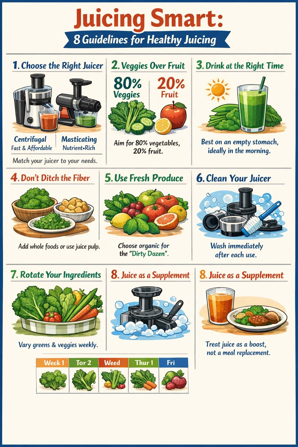 Wenn Sie eine klare Antwort wünschen: Entsaften funktioniert am besten, wenn es eine ausgewogene Ernährung ergänzt, anstatt Vollwertkost zu ersetzen. Der richtige Entsafter, die richtigen Zutaten und ein paar kluge Gewohnheiten machen den Unterschied zwischen einer wirklich gesunden Routine und einer Routine, die Sie still und leise mit Zucker überhäuft. Die folgenden 8 Richtlinien durchbrechen das Gerede und bieten Ihnen einen praktischen Rahmen, dem Sie tatsächlich folgen können.