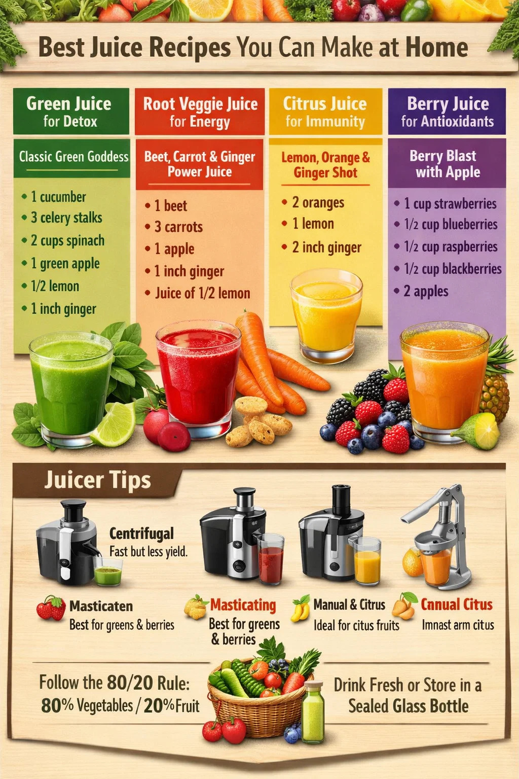 Das Beste anders Saft Rezepte kombinieren Gemüse und Obst grob Verhältnis von 80 % Gemüse zu 20 % Obst So erhalten Sie maximale Nährstoffe ohne überschüssigen Zucker. Unabhängig davon, ob Sie einen Zentrifugal-Entsafter oder einen Kaltpress-Entsafter verwenden, sind die Kernkategorien dieselben: grüne Säfte, Wurzelgemüsemischungen, Zitrusmischungen, Getränke auf Beerenbasis und tropische Kombinationen. Jede Kategorie dient einem anderen Ernährungszweck, und sobald Sie das Muster verstanden haben, ist es ganz einfach, Ihre eigenen Rezepte von Grund auf zu erstellen. In den folgenden Abschnitten werden alle wichtigen Typen erläutert, mit genauen Zutatenmengen, Gesundheitsdaten und praktischen Tipps, die unabhängig davon funktionieren, welchen Entsafter Sie besitzen.