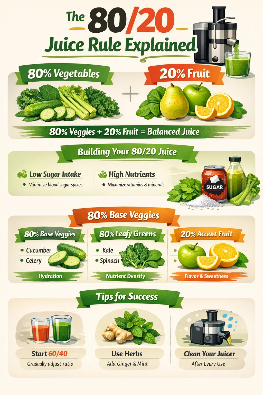 Die 80/20-Regel für das Entsaften ist eine Ernährungsrichtlinie, die besagt, dass für jedes Glas Saft, das Sie produzieren, 80 % der Zutaten sollten Gemüse und nur 20 % Obst sein . Dieses Verhältnis soll die Aufnahme von Phytonährstoffen und Mineralien maximieren und gleichzeitig den Verbrauch von Fruktose strikt begrenzen. Bei Verwendung eines hochwertigen Entsafter macht es einfach, köstliche Zubereitungen zuzubereiten. Wenn man sich zu sehr auf süße Früchte verlässt, kann dies zu unerwünschten Blutzuckerspitzen führen und viele der gesundheitlichen Vorteile der Frischextraktion zunichte machen.